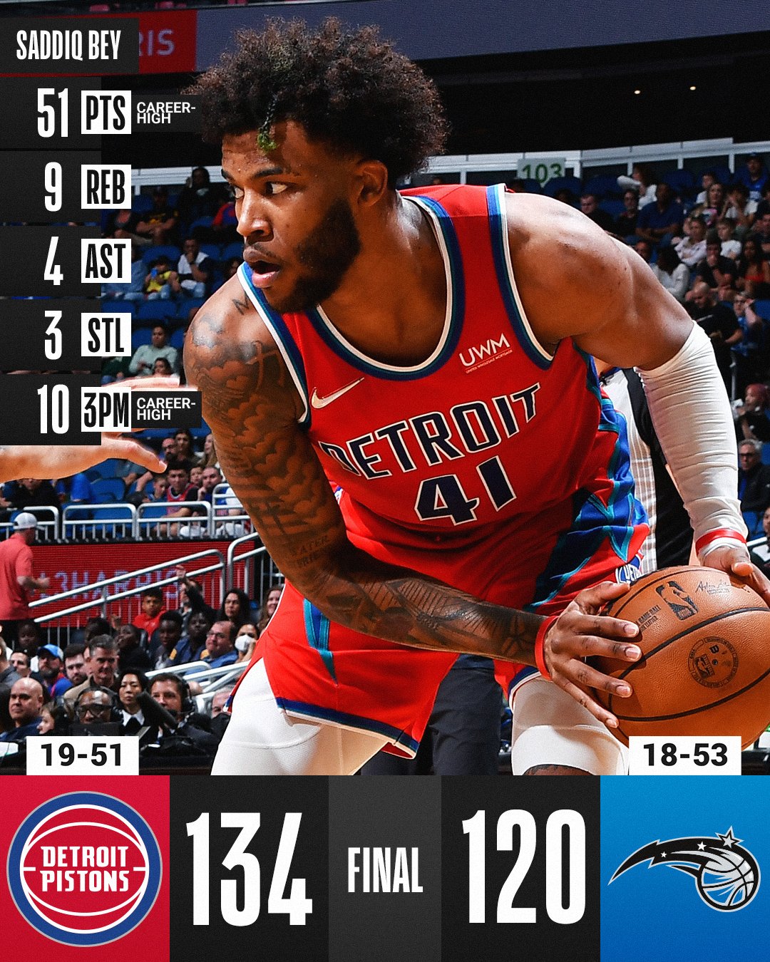 Saddiq Bey | Detroit Pistons | NBA.com Saddiq Bey: Career-best performance Thursday. Bey contributed 51 points (17-27 FG, 10-14 3Pt, 7-10 FT), nine rebounds, four assists and three steals in 39 minutes during Thursday's 134-120 win ...